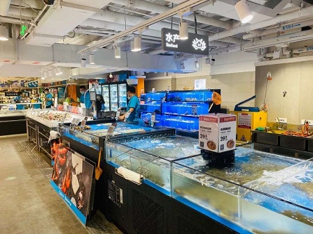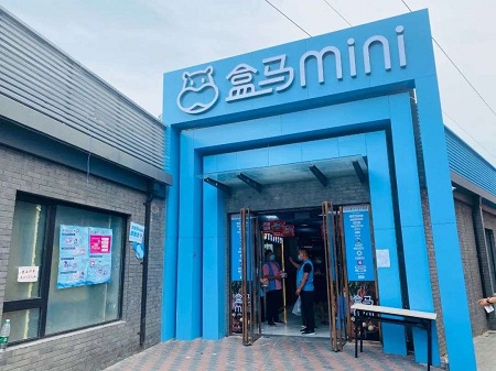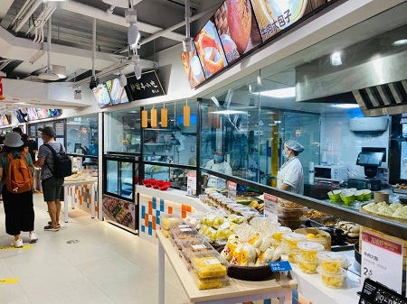 Hema has recently introduced their first two Hema mini concept stores in Beijing. If the format turns out to be successful, it will be rolled out and use across the country in order to enter more residential areas. With 800 m2 total area, the size has been significantly reduced. Due to downsizing, the store doesn’t use hanging chain conveyor anymore, but relays mainly on manpower. The types of food they offer for home delivery is also limited compared to the Hema fresh stores but they make sure that the selection is focusing on the basic categories common in the residents’ lives.