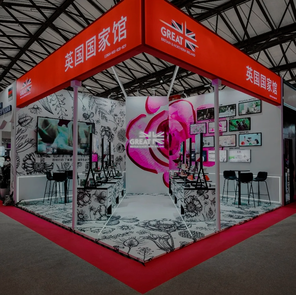 Inspired by traditional British apothecaries, the design combined classic elements with modern aesthetics. White surfaces, black metal accents, and foliage-inspired graphics created a clean, sophisticated space. Strategically placed greenery added a touch of vitality, connecting with both British and Chinese cultural elements. This thoughtful design made the Pavilion a key highlight of the showcase, effectively representing the quality and innovation of British beauty brands.