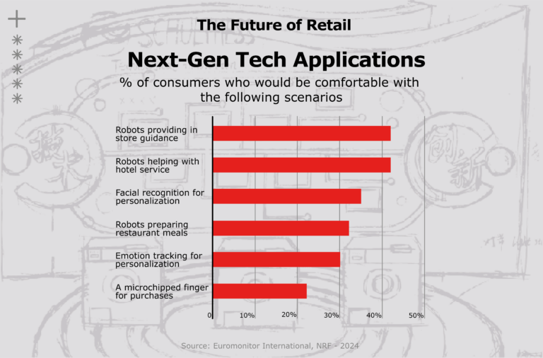 Consumers are increasingly open to new retail technologies such as robots, facial recognition, and automated services, shaping the future of shopping experiences.